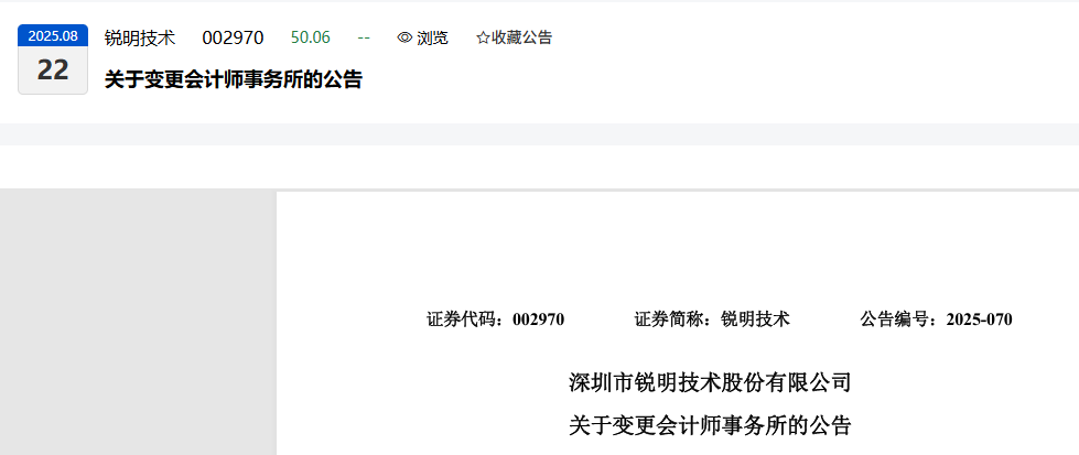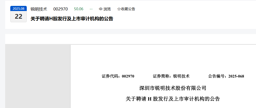 深圳市锐明技术股份有限公司(以下简称“公司”)于2025年8月20日召开第四届董事会第十四次会议、第四届监事会第十四次会议,全票审议通过《关于聘请H股发行及上市审计机构的议案》,同意聘任毕马威会计师事务所(以下简称“毕马威”)为公司发行境外上市外资股(H股)股票并在香港联合交易所有限公司(以下简称“香港联交所”)主板上市(以下简称“本次发行并上市”)的申报审计机构。现将有关情况公告如下: